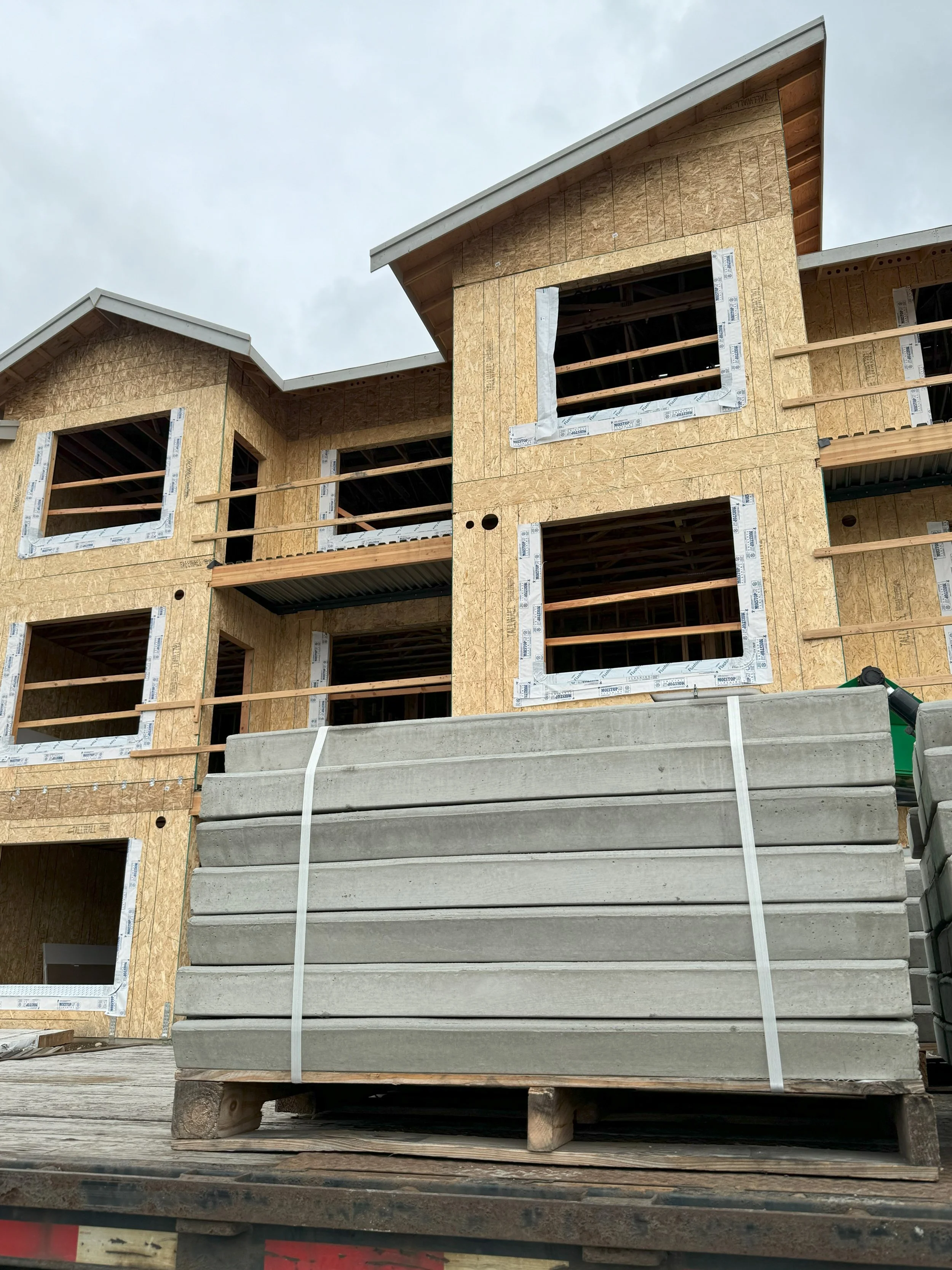 Construction site with stacks of concrete train ties on pallets and bags of TimberStrand LSL lumber in the background, with an excavator and dirt piles in the distance.